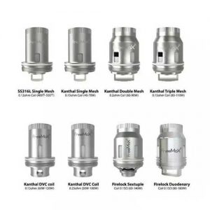 | Coil Types | 0.12ohm SS316L Single Mesh, 0.15 Kanthal DVC, 0.15ohm Firelock Duodenary, 0.15ohm Firelock Sextuple, 0.15ohm Kantal Single Mesh, 0.15ohm Kantal Triple Mesh, 0.15ohm Quad Mesh, 0.25 Kanthal DVC, 0.2ohm Kantal Double mesh |