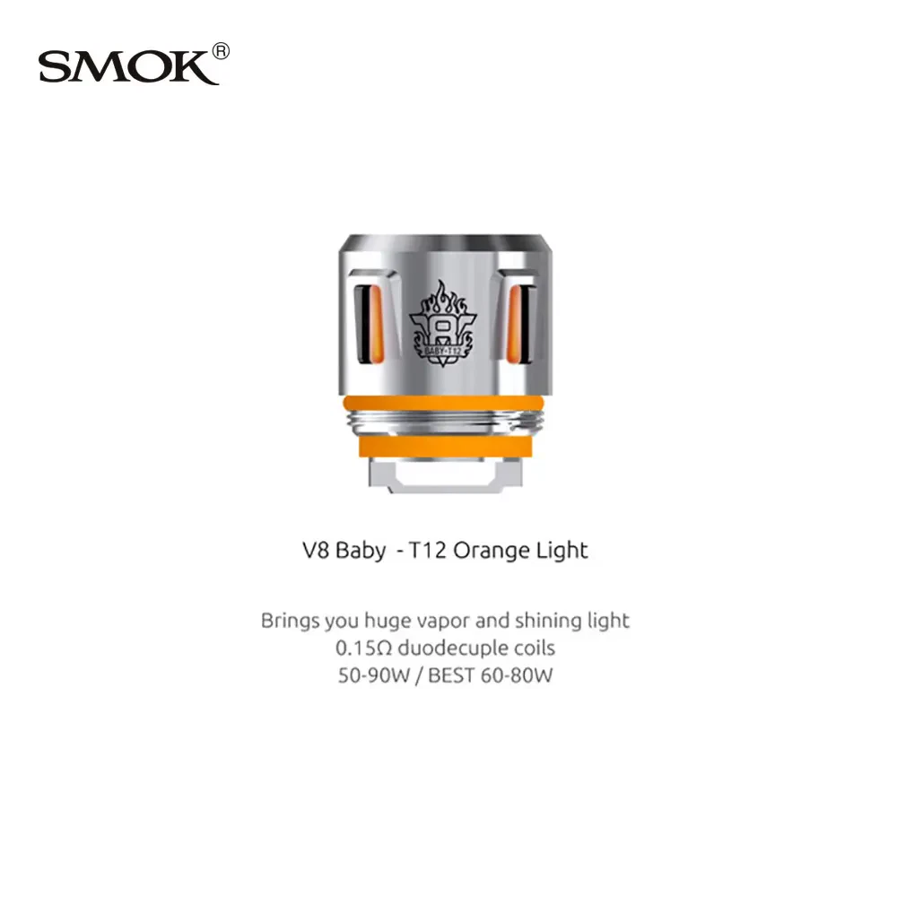 SMOK V8 Baby Core includes the V8 Baby-Q4, V8 Baby-T12, V8 Baby-T12 Red Light, V8 Baby-T12 Green Light, V8 Baby-T12 Orange Light. It is designed for the TFV12 Baby Prince and the SMOK TFV8 Baby.