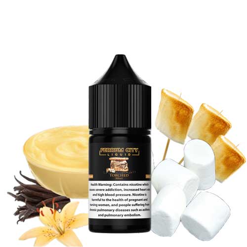 Torched Saltnic – Ferrum City. Perfectly captures the savory complexity of melted marshmallows mixed with vanilla custard. Topped with bits of warm sugar cookies! Therefore, you will enjoy vaping it.